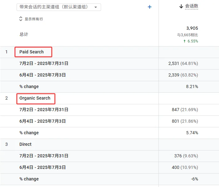 过去30天,网站整体流量增长6.55%,其中付费流量增长8.2%,自然流量增长5.74%。平均会话时长提升至3分,用户粘性增强。
